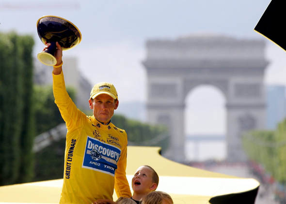 在陰雨天氣中,身著各色鮮艷比賽服的環(huán)法自行車賽選手經(jīng)過艱苦的騎行,傍晚抵達巴黎香榭麗舍大街。數(shù)以萬計的巴黎市民和游客沿香街觀看比賽并為參賽車手加油助威。比賽結(jié)束后,在以凱旋門為背景的頒獎臺上,阿姆斯特朗捧起了冠軍獎杯。他說:“自行車是一項激動人心的體育運動。我喜愛環(huán)法自行車賽,這項賽事傾注了我許多心血。自行車也是一項極為艱苦的比賽,需要付出很大的努力!