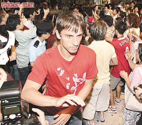 前晚十一時半,球星開始出動夜店,各球星包括里奧·費迪南德,弗萊徹,魯尼,范尼斯特魯伊,西爾維斯特,阿蘭·史密斯,羅西,薩哈等在保安陪同下,浩浩蕩蕩抵達中環(huán)Kee Club,現(xiàn)場早有近百名球迷守候,加里·內(nèi)維爾還貪玩搞記者鏡頭,致一名記者跌倒,令隨后的斯科爾斯幾乎踩到記者身上,因場面混亂,要出動十多名警員到場維持秩序。