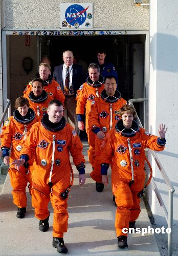圖:“發(fā)現(xiàn)號”機(jī)組從指揮部和終檢大樓出發(fā)
