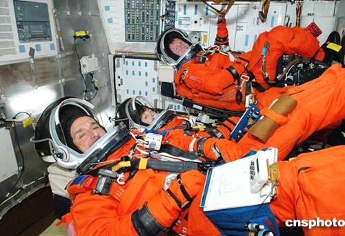 圖:美國“發(fā)現(xiàn)號”機(jī)組人員進(jìn)入太空艙里