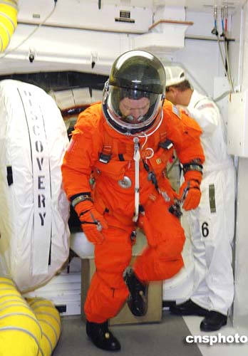 圖:美國“發(fā)現(xiàn)號”機組進入太空艙準(zhǔn)備發(fā)射
