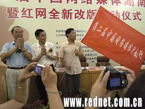圖:湖南省委、省政府領(lǐng)導為采訪團授旗