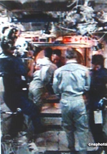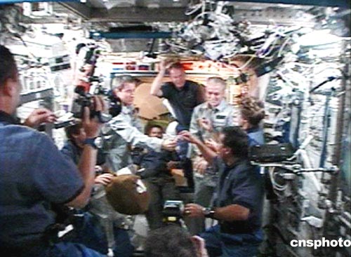 航天飛機(jī)發(fā)現(xiàn)號(hào)是7月28日7時(shí)18分(北京時(shí)間19時(shí)18分)和國(guó)際空間站軌道對(duì)接,經(jīng)過(guò)密封檢查,機(jī)組于美國(guó)東部時(shí)間8:50進(jìn)入國(guó)際空間站。七名宇航員結(jié)束了兩天奔向空間站的飛行,這是自美國(guó)航天飛機(jī)2002年12月離開后,如今第一次造訪空間站。兩個(gè)機(jī)組會(huì)師太空,相互擁抱問(wèn)候。