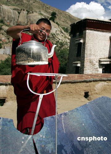 | 夏日的西藏色拉寺,一位僧侶在使用太陽能灶燒水。西藏自治區(qū)實施“陽光計劃”十多年以來,全區(qū)已累計建立三千瓦至五千瓦的光伏電站三百多座,推廣各類小型獨立光伏發(fā)電系統(tǒng)約五千四百千瓦,已有近五十多萬農(nóng)牧民因此告別了無電歷史。在西藏,太陽能資源已用于照明、通訊、廣播電視、燒水做飯、取暖等方面。作者:武仲林