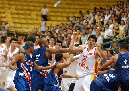 29日晚中國與波多黎各隊的比賽進行到離比賽結(jié)束還有1分29秒時,波多黎各隊4號球員曼紐爾對易建聯(lián)惡意犯規(guī),結(jié)果導(dǎo)致雙方球員在賽場內(nèi)群毆。國際籃聯(lián)最終決定給予雙方全部球員開除出場的處罰,但比賽結(jié)果還保留,中國隊91:80獲勝。