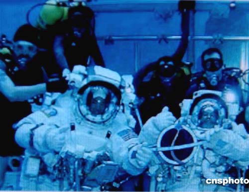 圖:美國公布發(fā)現(xiàn)號宇航員訓(xùn)練太空行走的照片