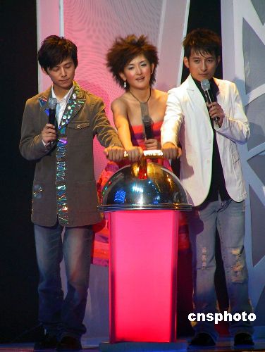 7月30日晚,陪伴中國(guó)觀眾走過(guò)8年歲月的娛樂(lè)節(jié)目《快樂(lè)大本營(yíng)》進(jìn)行了改版晚會(huì),快樂(lè)主持群何炅(左)、李維嘉(右)、謝娜進(jìn)行了一場(chǎng)告別演唱會(huì)。在接下來(lái)的一個(gè)月里,他們將通過(guò)觀眾短信票選來(lái)決定誰(shuí)能繼續(xù)留任。圖為快樂(lè)主持群一起開(kāi)通短信支持通道。作者:鄧霞