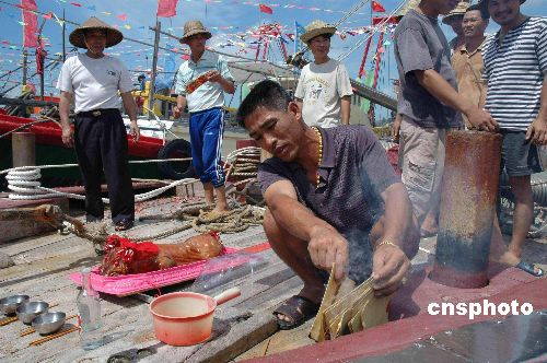 八月一日南海開漁。已休息了兩月之久的廣東陽江海陵島閘坡漁港的漁民們,在揚帆起航前舉辦隆重拜祭船頭儀式,以祈求平安吉利魚滿艙。圖為漁民在船頭拜訪拜祭用品。作者:索有為