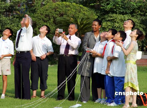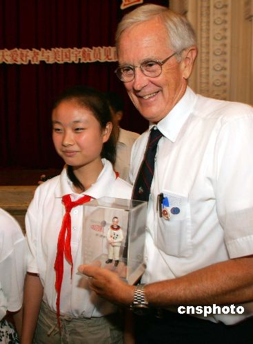 正當(dāng)美國(guó)“發(fā)現(xiàn)號(hào)”航天飛機(jī)遨游太空吸引全球目光時(shí),八月一日,“發(fā)現(xiàn)號(hào)”的前指令長(zhǎng)查爾斯·博爾登(左四)、曾隨阿波羅號(hào)登月的航天員查爾斯·杜克(左二)、美國(guó)首位黑人女航天員梅·杰米森(左五)來(lái)到上海中福會(huì)少年宮,與上海少年航天愛(ài)好者見(jiàn)面。