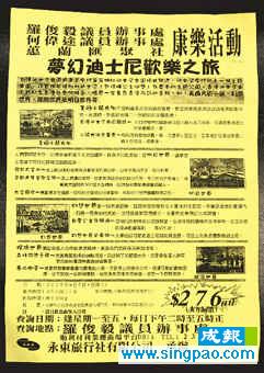 2日,記者在某商場內(nèi)不同角落,發(fā)現(xiàn)張貼了印有276元迪士尼“優(yōu)惠團(tuán)”的宣傳單張,由永東旅行社接待,團(tuán)費(fèi)包括來回空調(diào)車接送。