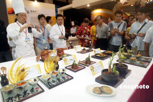 八月四日,二○○五年臺北“中華美食展”在臺北世貿中心開幕,在美食展中舉行的廚藝邀請賽中,來自大陸的廚師展示了精湛廚藝,吸引了不少參觀者,也吸引了同行來學藝。作者:盛佳鵬