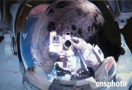 發(fā)現(xiàn)號(hào)宇航員羅賓遜歷史性的自拍照,頭盔里映照出太空中的自己和航天飛機(jī)。