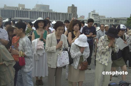 廣島市每年都要在和平公園舉行儀式。今年的紀(jì)念儀式從6日當(dāng)?shù)貢r(shí)間早上8點(diǎn)15分準(zhǔn)時(shí)開始,這正好是60年前美軍飛機(jī)投下原子彈的那一刻。