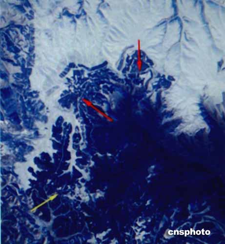 美國(guó)宇航員在國(guó)際空間站拍攝的中國(guó)內(nèi)蒙古境內(nèi)的一段長(zhǎng)城,紅色和黃色箭頭所指的細(xì)小地段,距北京西北部約二百五十英里。作者:賈國(guó)榮