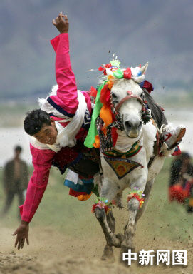 8月7日,西藏牧民在靠進(jìn)拉薩的薩拉鎮(zhèn)(Tsara)騎術(shù)比賽上撿起白色的哈達(dá),展示騎術(shù)。每年豐收時節(jié),牧民們會聚集在一起,展示他們的騎術(shù)。