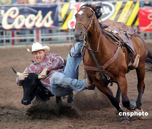 火爆激烈的牛仔競(jìng)技大賽日前在美國(guó)堪薩斯州道奇城開幕。圖為8月5日,,來自俄克拉荷馬州的牛仔正在參加摜牛比賽。道奇城是美國(guó)著名的“牛仔城”,以其濃郁的西部風(fēng)情和牛仔文化著稱于世。作者:Ic/cnsphoto