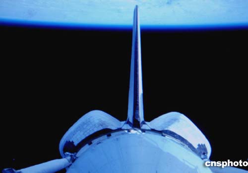 “發(fā)現(xiàn)號(hào)”漂亮的尾翼,在返航途中起著重要的減速作用。(NASA)