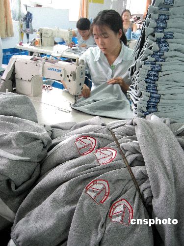 8月10日,歐盟委員會昨日表示,為避免給歐盟進口商和零售商造成損失,歐盟將允許部分超出配額的中國產套衫和長褲這兩類紡織品進入歐盟市場。歐盟貿易委員曼德爾森在一份聲明中表示,在今年7月11日前啟運的中國套衫和長褲不管是否超出配額,都將被允許進口。圖為寧波一企業(yè)正在加緊生產出口套衫和長褲。作者:張和平