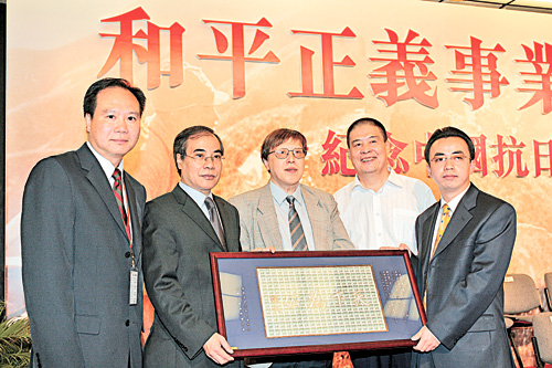 中新網(wǎng)8月11日電 中華全國(guó)集郵聯(lián)合會(huì)與海峽兩岸出版交流中心為紀(jì)念“和平正義事業(yè)的偉大勝利──紀(jì)念中國(guó)抗日戰(zhàn)爭(zhēng)暨世界反法西斯戰(zhàn)爭(zhēng)勝利六十周年展覽”,向展覽籌委會(huì)捐贈(zèng)了名為《天下為公》的題詞郵票鏡屏。