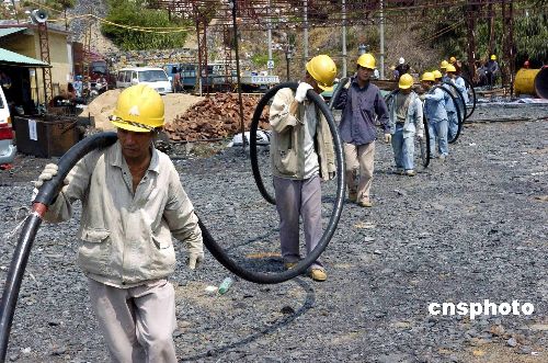 十一日,廣東興寧大興透水煤礦再加裝從河南省調(diào)來的九百千瓦大功率潛水泵,以加快井下排水進度。圖為搶險人員在為大功率水泵鋪設電纜。作者:羅仰明