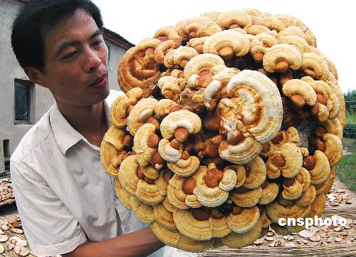 | 揚州市維揚區(qū)西湖鎮(zhèn)農(nóng)民鄭玉權(quán)展示他培育的一株特大靈芝。該靈芝呈扁圓形,赤黃色,直徑有68厘米,重5千克,其上面還附有近百個小靈芝頭。如此大的靈芝在當(dāng)?shù)貙崒俸币。作者:張丙?object align="left" classid="clsid:D27CDB6E-AE6D-11cf-96B8-444553540000" codebase="http:///pub/shockwave/cabs/flash/swflash.cab#version=5,0,0,0" height="250" width="350">
