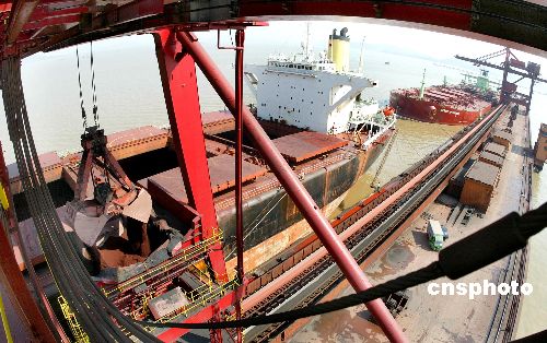 2005年8月11日,據(jù)商務部新聞辦公室披露,今年上半年,我國鐵礦石進口1.3億噸,同比增長34.5%,增幅比上年同期回落6個百分點。今年國家出臺有關宏觀調控措施,加強了鐵礦石進口協(xié)調,規(guī)范了市場秩序,成效顯著,鐵礦石進口達到了預期調控目標。今年我國鐵礦石進口增幅將大幅回落。圖為二艘外國礦砂船正在我國港口卸礦砂。作者:張和平