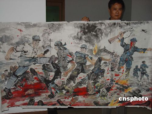 為紀念抗戰(zhàn)勝利六十周年,常德老畫家楊格正專心繪制其長幅畫卷《血戰(zhàn)常德》。整幅畫卷分為戰(zhàn)爭、救死扶傷、悼念三大部分,再現(xiàn)了當年常德會戰(zhàn)的情景。目前,兩幅長兩米、高一米,描繪戰(zhàn)爭場面的畫幅已經完成。作者:鄧霞