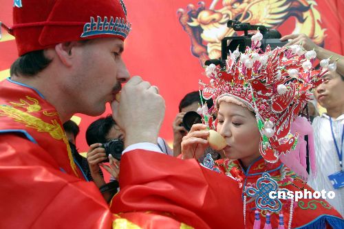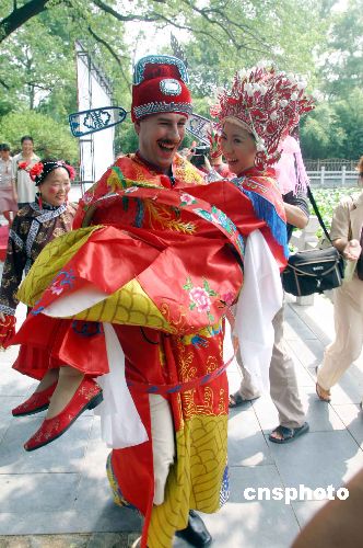 | 8月14日,濟南市大明湖景區(qū),來自荷蘭的楊文軒(Jan)先生與濟南姑娘黨妍舉行了一場傳統(tǒng)的中國式婚禮,婚禮上倆人按照中國的傳統(tǒng)習俗舉行了坐花轎、掀蓋頭、夫妻對拜等儀式。新娘黨妍今年28歲,2003年9月遠赴荷蘭愛因霍芬科技大學學習計算機專業(yè),同年認識了荷蘭小伙楊文軒(Jan),從此就開始了這段跨國姻緣。作者:龔輝
