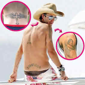 英國球星大衛(wèi)·貝克漢姆的家庭成員——6歲的布魯克林、2歲的羅密歐和5個(gè)月的克魯茲,以及妻子維多利亞——都在他身上留有永久的痕跡,不過他身上還有一些宗教色彩的文身,包括一個(gè)小天使和一個(gè)帶翅膀的十字架,據(jù)這些文身的作者說,“他把這些看做是保護(hù)孩子的守護(hù)神”。
