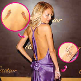 跟帕麗斯·希爾頓一塊出演真人秀《簡單生活》的妮可·里奇,文身也崇尚簡單,她的背上文了一對(duì)精巧的天使翅膀,右手腕上文了“Virgin”處女字樣,脖子上文了一個(gè)花環(huán)。