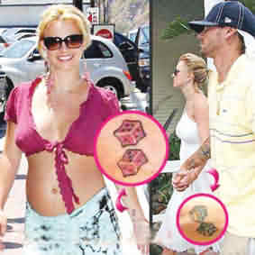 2004年5月,小甜甜布蘭妮和現(xiàn)在的老公凱文·費(fèi)德林同去愛爾蘭首都都柏林,兩人都在手腕上文了一對(duì)骰子圖案,一個(gè)紅色、一個(gè)藍(lán)色,這顯然是個(gè)幸運(yùn)的文身,一周后在返回美國的飛機(jī)上,他們訂婚了。