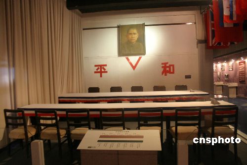 | 以六十年前日軍中國戰(zhàn)區(qū)投降儀式的真實(shí)文物組成的歷史場景,8月15日在南京博物院正式展出。這次展出的中國戰(zhàn)區(qū)日軍投降簽字儀式的文物有:兩張長條桌、背景墻上掛著孫中山像、會場的掛鐘、當(dāng)時中國代表何應(yīng)欽和日本代表岡村寧次使用的毛筆和硯臺等文具等均為真實(shí)文物。作者:陳光明