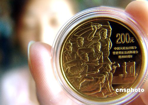 中國(guó)人民銀行于2005年8月15日發(fā)行中國(guó)人民抗日戰(zhàn)爭(zhēng)暨世界反法西斯戰(zhàn)爭(zhēng)勝利60周年金銀紀(jì)念幣一套。該套紀(jì)念幣共2枚,其中金幣1枚,銀幣1枚,均為中華人民共和國(guó)法定貨幣。作者:馬健