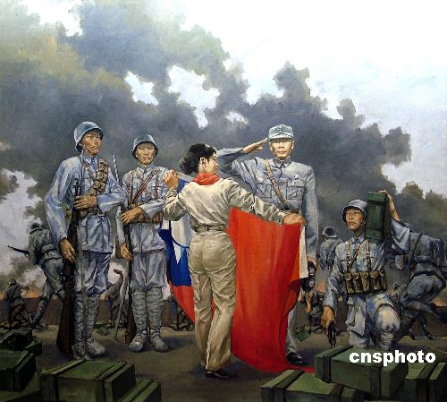 8月16日,《永恒的記憶--紀念中國人民抗日戰(zhàn)爭暨世界反法西斯戰(zhàn)爭勝利60周年京滬美術作品聯(lián)展》在上海美術館舉辦。畫家羅林創(chuàng)作的一幅體現(xiàn)抗日英雄謝晉元迎接冒險送國旗的童子軍楊惠敏的油畫在展會中展出。圖片拍攝:井韋