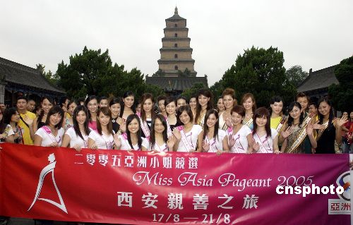 8月17日,參加西安“2005亞洲小姐總決賽”的20位內(nèi)地妙齡佳麗以及來自香港的12位選手和上屆冠軍呂晶晶、馮梓瑩一行抵達古城西安,并游覽了久負盛名的大慈恩寺,吸引了眾多中外游客。作者:侯智