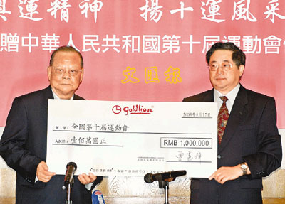 捐贈(zèng)儀式昨天上午在香港金利來公司內(nèi)舉行,江蘇省人民政府副秘書長兼第10屆全國運(yùn)動(dòng)會(huì)組委會(huì)副秘書長吳經(jīng)起,代表江蘇省政府及全運(yùn)會(huì)組委會(huì)接受了捐款支票。并代表省長梁寶華、代表第十屆全國運(yùn)動(dòng)會(huì)組委會(huì)和江蘇省政府對(duì)曾憲梓博士表示崇高敬意和衷心感謝。