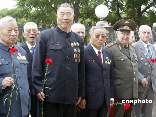 八月十八日,被邀請參加“和平使命—2005”中俄聯(lián)合軍事演習(xí)開幕儀式的中國抗日老戰(zhàn)士和前蘇聯(lián)戰(zhàn)爭功勛軍人,來到“太平洋艦隊戰(zhàn)斗榮譽”紀念碑敬獻花圈,向在衛(wèi)國戰(zhàn)爭中英勇犧牲的俄羅斯軍人致以崇高的敬意。作者:王麗南
