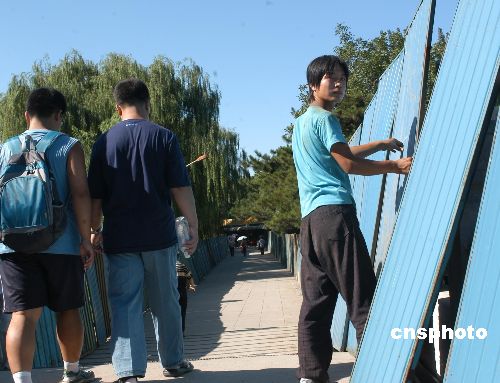 圖為圓明園三園之一的綺春園工人在繼續(xù)設(shè)置封閉鐵板。按照環(huán)保總局要求,綺春園除入水口外,已鋪防滲膜應(yīng)全部拆除,回填黏土和原湖底底泥。作者:鄒憲