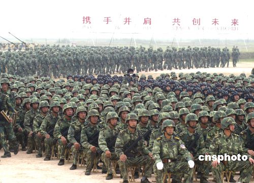“和平使命-2005”中俄聯(lián)合軍事演習(xí),中俄雙方參演兵力近萬人,中方參演兵力七千余人。八月二十日,中俄聯(lián)合軍事演習(xí)第二階段在中國青島開始。圖為十六日參加中俄聯(lián)合軍事演習(xí)的中國參演部隊(duì)在演練場(chǎng)集結(jié)。作者:王麗南