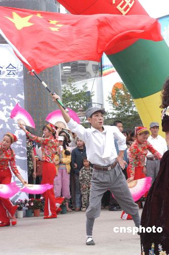 人日二十一日,昆明市紀(jì)念反法西斯戰(zhàn)爭(zhēng)暨抗日戰(zhàn)爭(zhēng)勝利六十周年文藝演出活動(dòng)在市中心廣場(chǎng)舉行。圖為群眾演出團(tuán)體演員,身穿八路軍服裝,表現(xiàn)全民抗戰(zhàn)的歷史場(chǎng)景。作者:鄒憲