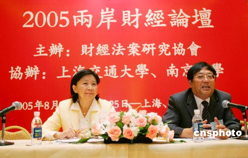 八月二十二日,“二○○五兩岸財經(jīng)論壇”在上海舉行,多名中國國民黨籍、親民黨籍“立委”以及三十多名臺灣金融界知名人士出席了本次論壇。圖為親民黨籍“立委”劉憶如(圖左)與上海交大安泰管理學院院長(右)王方華在本次論壇上。作者:湯彥俊