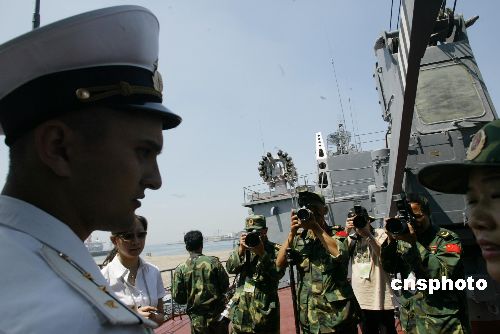八月二十二日,中國(guó)部分媒體被中俄軍事演習(xí)俄軍方邀請(qǐng),參觀采訪此次參加演習(xí)的俄羅斯反潛艦,這艘?吭谇鄭u港的艦艇正整裝待發(fā),明日將起航參加海上封鎖演習(xí)。圖為中國(guó)軍方記者對(duì)一位在艦上值勤的俄海軍軍官產(chǎn)生濃厚興趣。作者:王麗南