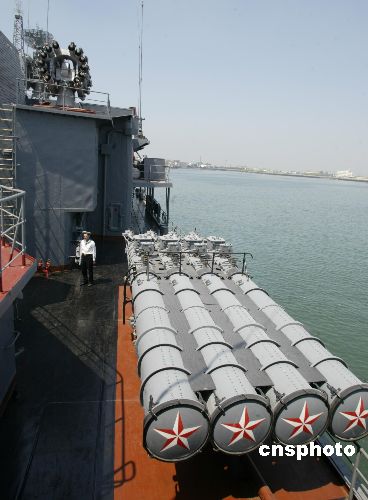 八月二十二日,中國部分媒體被俄軍方邀請,參觀采訪此次參加演習的俄羅斯反潛艦,這艘?吭谇鄭u港的艦艇正整裝待發(fā),明日將起航參加海上封鎖演習。圖為反潛艦的一角。作者:王麗南