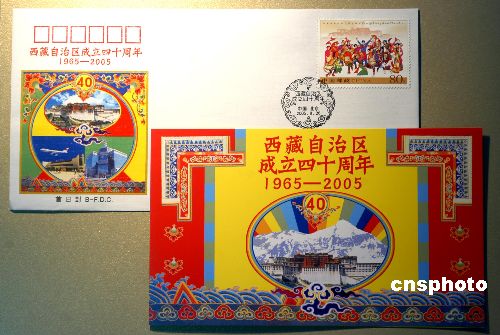 北京市郵票公司為配合國(guó)家郵政局于八月二十六日發(fā)行《西藏自治區(qū)成立四十周年》紀(jì)念郵票(一套一枚),特設(shè)計(jì)、印制了該郵票的首日封(上)、郵折(下)等郵品,并將于八月二十六日與郵票同時(shí)發(fā)行。郵票面值八十分。作者:鄒憲