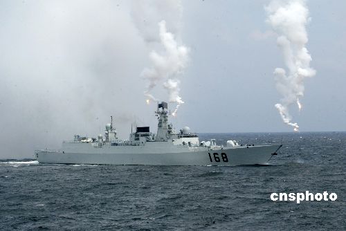 “和平使命-2005”中俄聯(lián)合軍事演習第三階段8月23日在中國山東半島及其附近海域舉行。圖為中國海軍驅逐艦釋放電磁干擾彈,抗擊來襲導彈。作者:王麗南