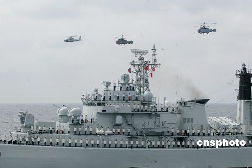 “和平使命-2005”中俄聯(lián)合軍事演習(xí)第三階段8月23日在中國山東半島及其附近海域舉行。圖為中俄艦機(jī)編隊(duì)接受聯(lián)合導(dǎo)演部檢閱時(shí),中方艦艇駛過觀摩艦時(shí)情景。作者:王麗南