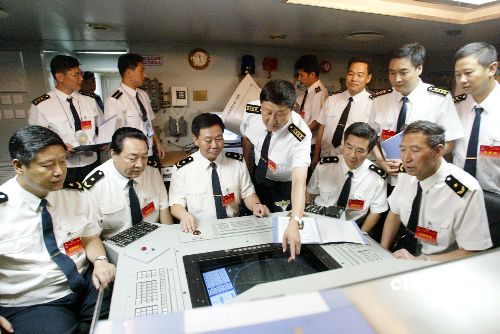 “和平使命-2005”中俄聯(lián)合軍事演習(xí)第三階段23日在中國(guó)山東半島及其附近海域開(kāi)始。圖為參加演習(xí)的中國(guó)北海艦隊(duì)指揮員在指揮倉(cāng)內(nèi)指揮演習(xí)的情景。作者:王麗南