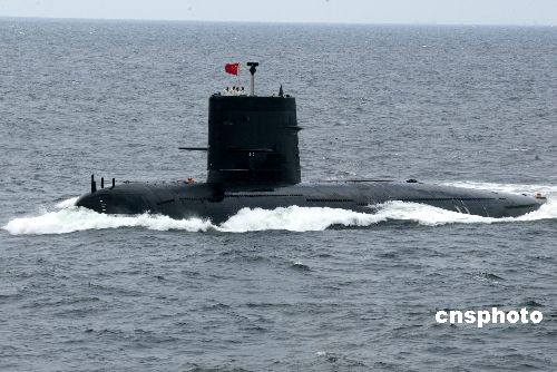 “和平使命-2005”中俄聯(lián)合軍事演習(xí)第三階段8月23日在中國山東半島及其附近海域開始,圖為中國潛艇駛過觀摩艦接受聯(lián)合導(dǎo)演部檢閱。作者:王麗南