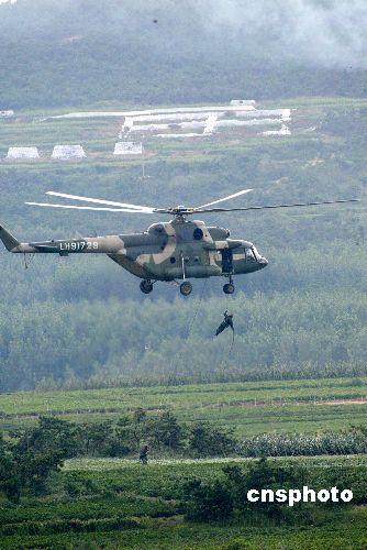 八月二十四日,“和平使命—2005”中俄聯(lián)合軍事演習(xí)第三階段兩棲登陸作戰(zhàn)實(shí)兵演練在山東半島展開。圖為中國(guó)特戰(zhàn)隊(duì)員實(shí)施繩降。作者:王麗南