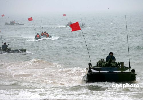 八月二十四日,“和平使命—2005”中俄聯(lián)合軍事演習(xí)第三階段兩棲登陸作戰(zhàn)實(shí)兵演練在山東半島展開,參加兩棲登陸作戰(zhàn)實(shí)兵演練的中國(guó)海軍陸戰(zhàn)隊(duì)水陸坦克向岸邊突擊。作者:王麗南